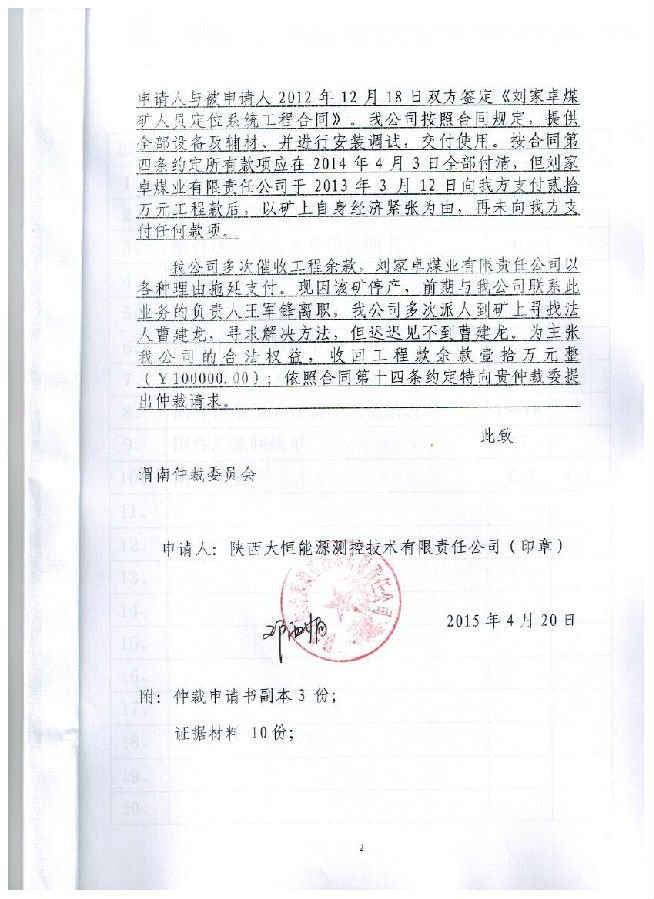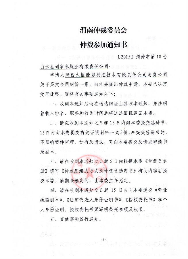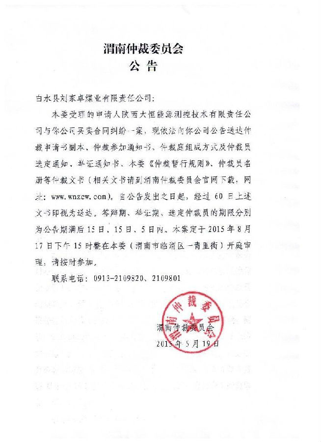 陜西大恒能源測控技術(shù)有限責(zé)任公司與白水縣劉家卓煤業(yè)有限責(zé)任公司買賣合同糾紛一案公告