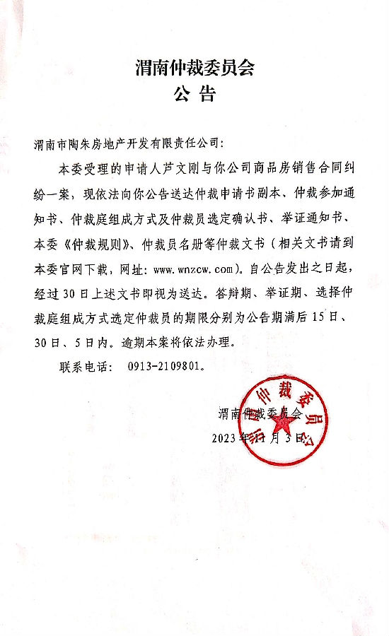 蘆文剛與渭南市陶朱房地產開發(fā)有限責任公司一案公告