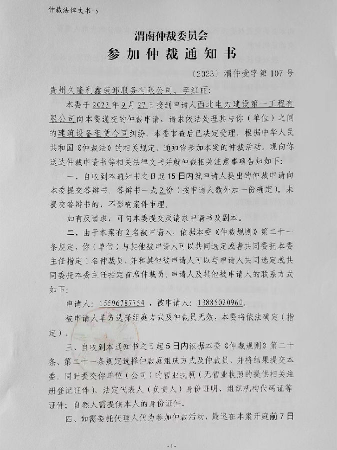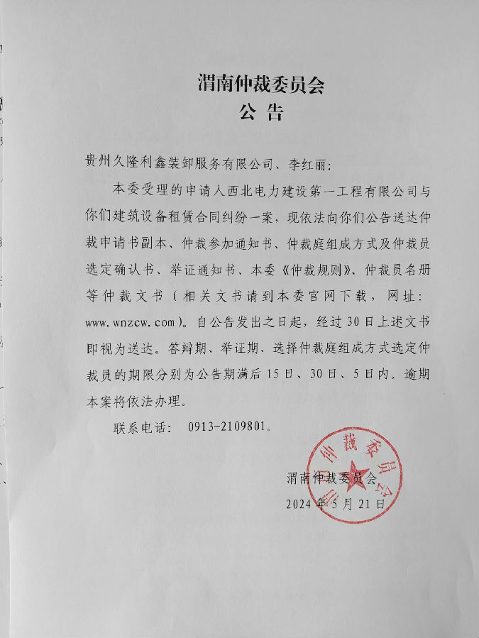 西北電力建設(shè)第一工程有限公司與貴州久隆利鑫裝卸服務(wù)有限公司、李紅麗建筑設(shè)備租賃合同糾紛案公告